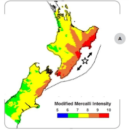 A credible, magnitude 8.9 earthquake generates extreme (MMI 9.0-12.0) ground shaking along the east coast of Aotearoa, with MMI 7 and above shaking lasting for minutes in places.